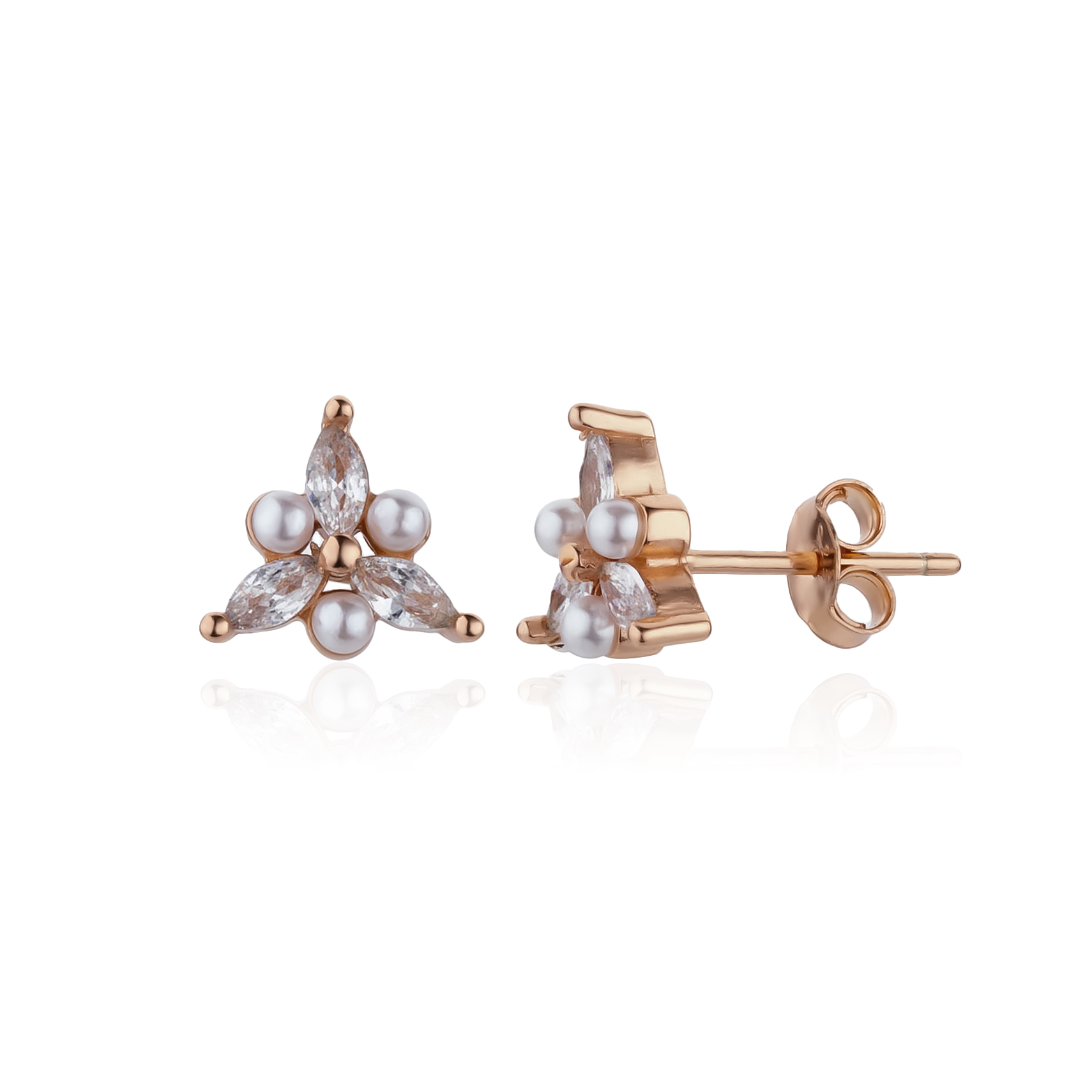 עגילי סטאד פרח צמודים רוז גולד יוקרתי בשיבוץ פנינים ואבני זירקון בחיתוך מרקיזה