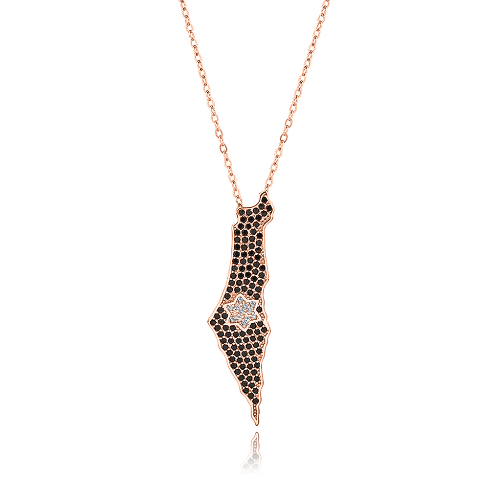שרשרת מפת ארץ ישראל בציפוי רוז גולד משובצת זירקונים שחורים ומגן דוד