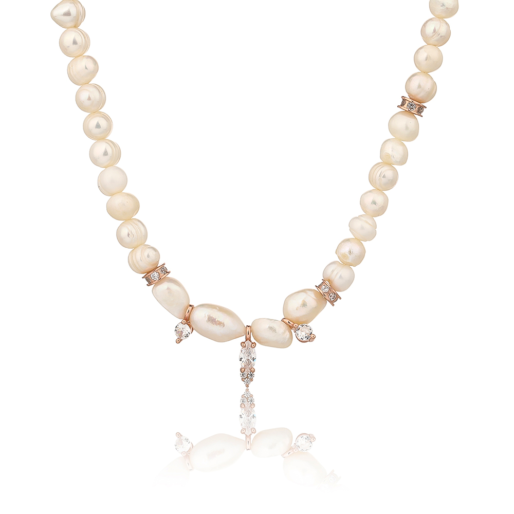 הוסיפי נגיעה של יוקרה קלאסית וניצנוץ מודרני למראה שלך עם שרשרת פנינים מלאה זו. השרשרת עשויה כולה מפניני מים מתוקים (Freshwater Pearls) נבחרות בצבע לבן-קרמי, המעניקות לה מראה על-זמני. החלק המרכזי של השרשרת מעוצב במיוחד וכולל שילוב מרהיב של פניני ברוק (baroque) ייחודיות יחד עם אלמנטים מנצנצים בכסף בציפוי רוז גולד, הכוללים תליון מרכזי מורכב בצורת טיפה/מרקיז המשובץ זירקונים ותליונים צדדיים תואמים. זהו פריט הצהרה אלגנטי וייחודי, מושלם לאירועים מיוחדים או כשדרוג יוקרתי ללוק היומיומי.