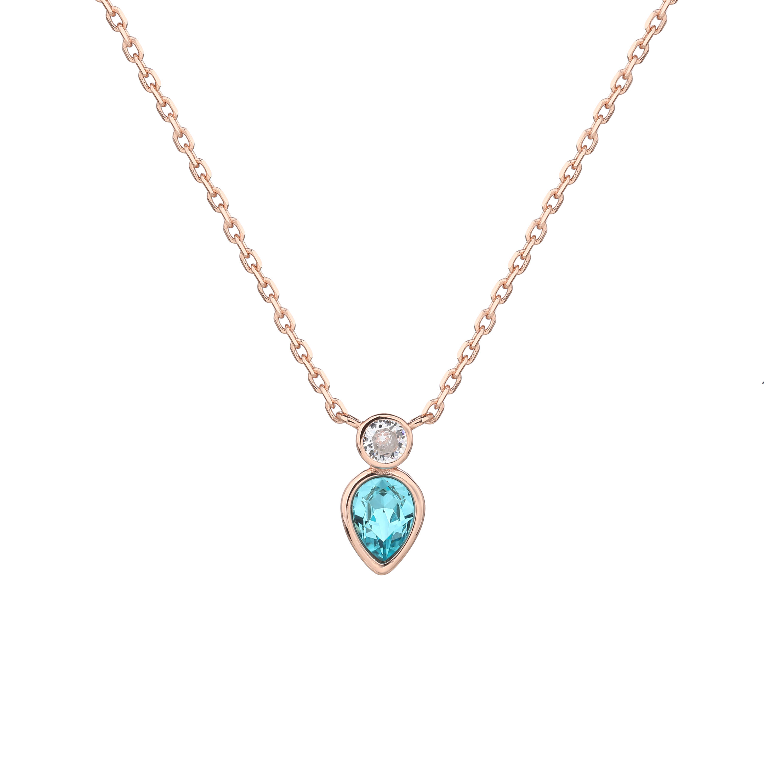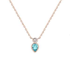 שרשרת רוז גולד עדינה עם תליון כפול: אבן עגולה שקופה ואבן טיפה כחולה-טורקיז